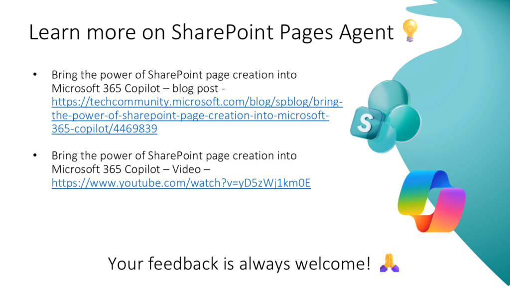 - Bring the power of SharePoint page creation into Microsoft 365 Copilot – blog post – https://techcommunity.microsoft.com/blog/spblog/bring-the-power-of-sharepoint-page-creation-into-microsoft-365-copilot/4469839
