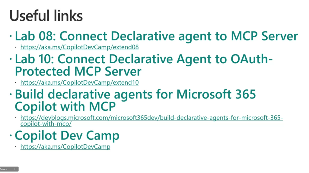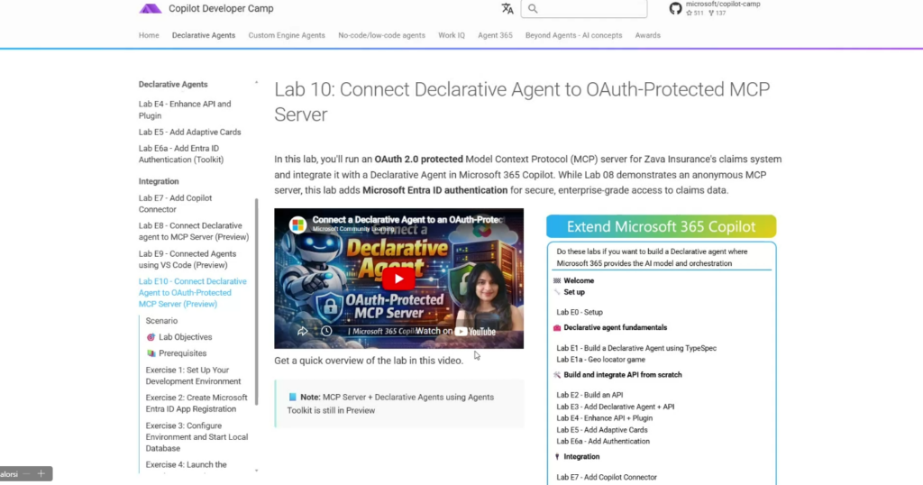 - Lab 10: Connect Declarative Agent to OAuth-Protected MCP Server – https://microsoft.github.io/copilot-camp/pages/extend-m365-copilot/10-mcp-auth/