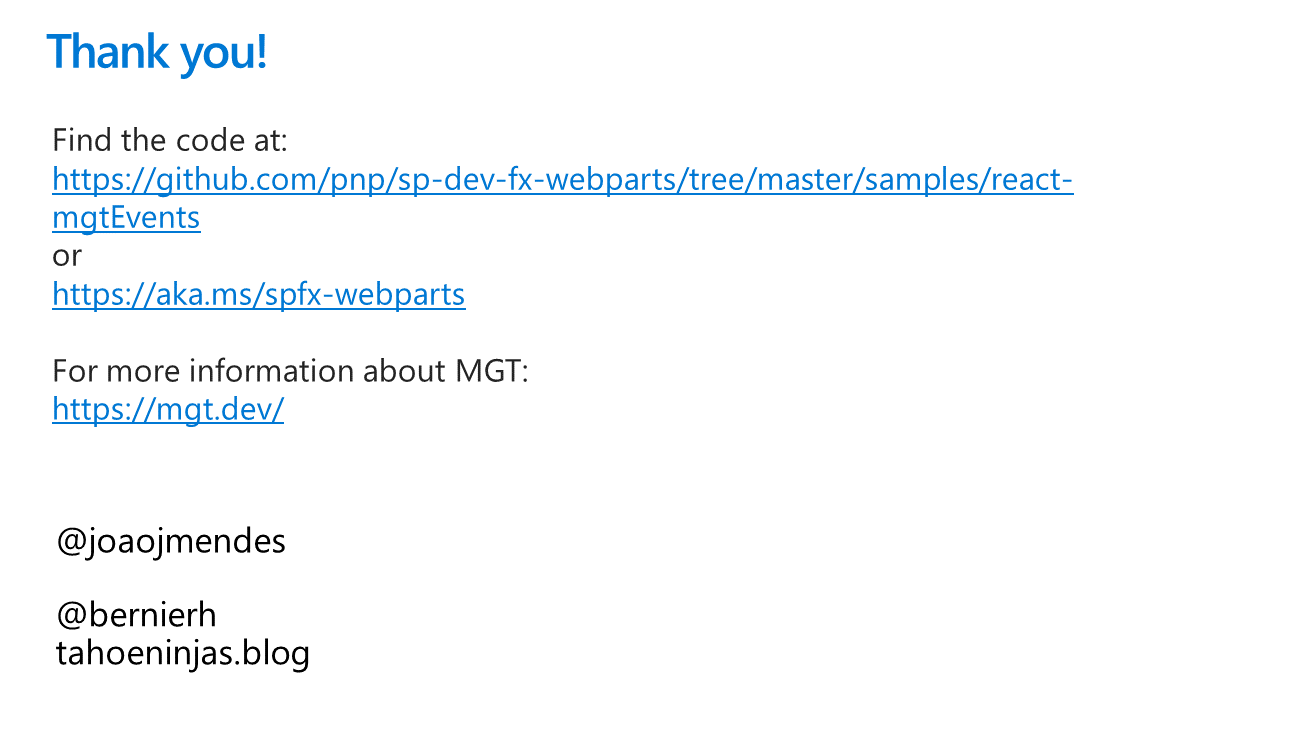 - Building personal events web part with SPFx and Microsoft Graph Toolkit – Hugo Bernier (Sample provided by João Mendes)