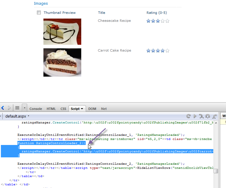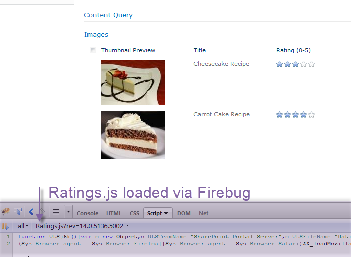 1. The ratings functionality is driven by a combination of CSS and JavaScript. A javascript file named “ratings.js” was now included on the page and is located in the “_layouts” folder.