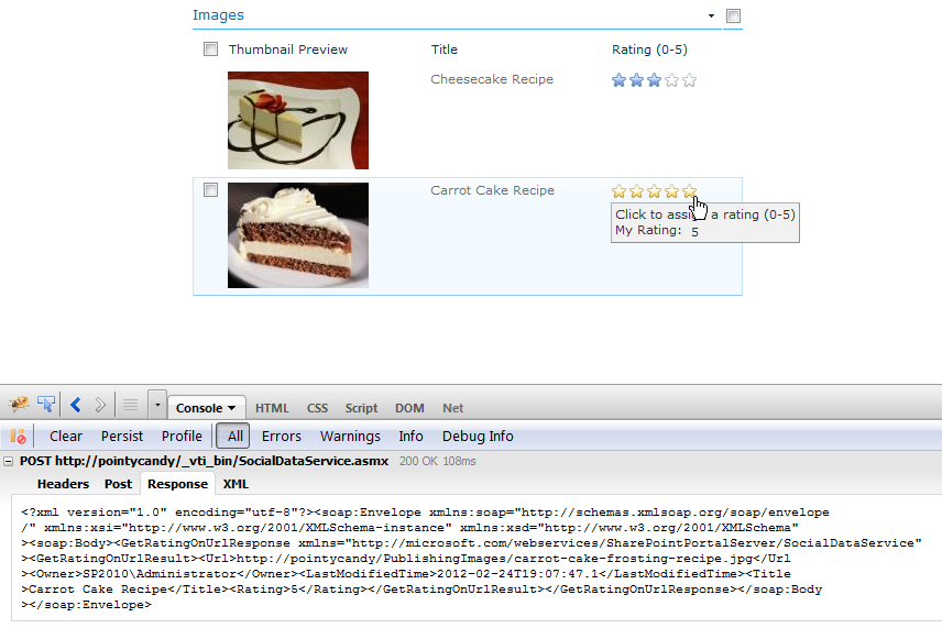 On a recent project, the request was to provide the ratings functionality outside of the typical list view when editing the list. Specifically, the desire was to use a CQWP (Content Query Web Part) to roll up all images stored throughout the site collection into a single view on a landing page so users could view the images and rate them all in one central location.
