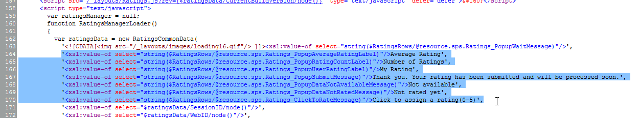 I also found that the tool tip hover event of the ratings control, which displays your selected rating and/or if no ratings have been selected and that verbiage was not displaying any data. While I would like to investigate why, I have not had time to do so. To fix this temporarily, I simply hard coded the alert verbiage in the “Ratings.xsl”. This does not hard code the ratings value included in the tool tip, just the descriptive text.