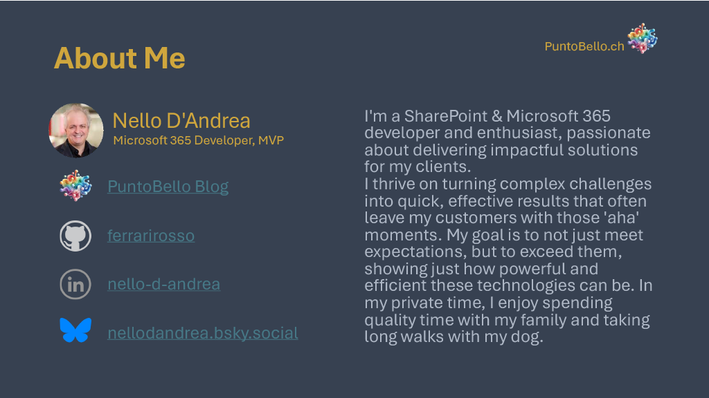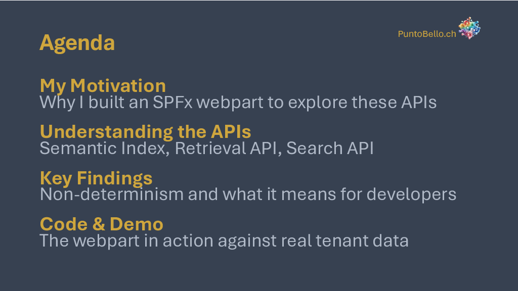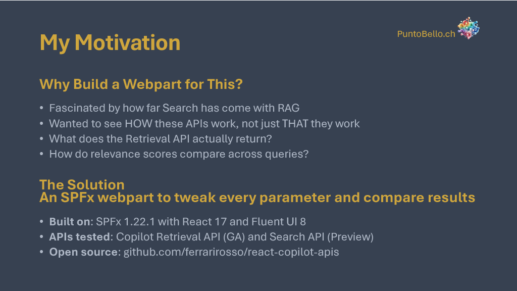 - Nello D’Andrea (die Mobiliar) – Testing the Copilot Retrieval and Search APIs with SPFx