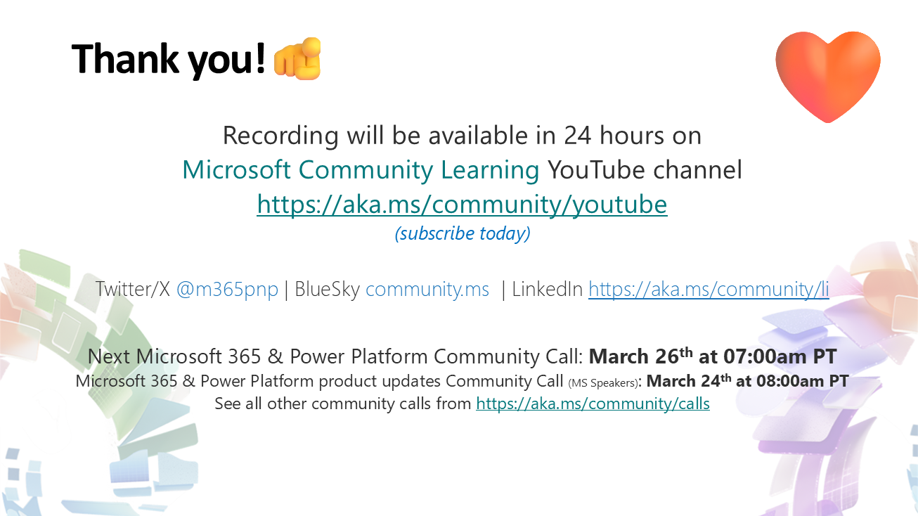 - Community Call YouTube Recording from Microsoft will be available when uploaded by Microsoft