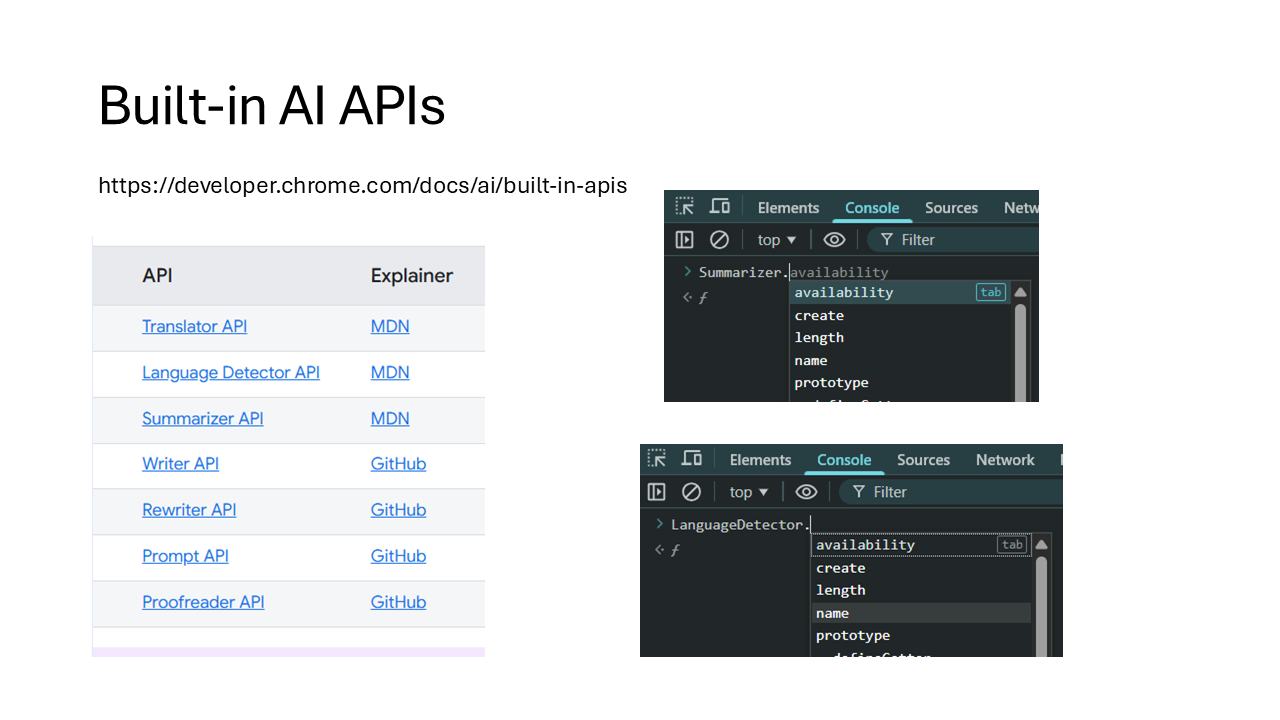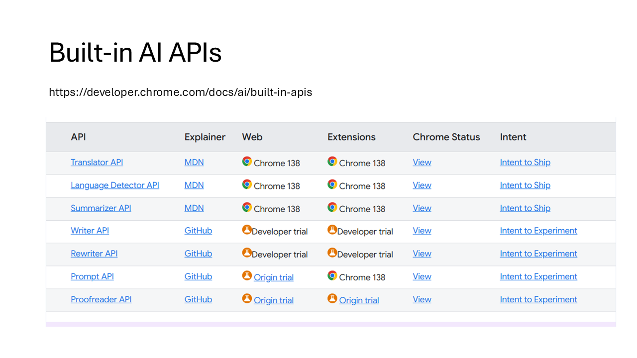 - Built-in AI APIs | AI on Chrome | Chrome for Developers – https://developer.chrome.com/docs/ai/built-in-apis