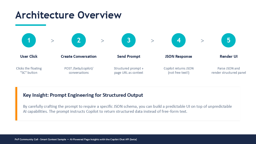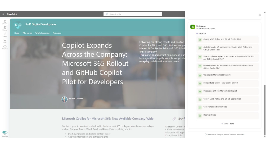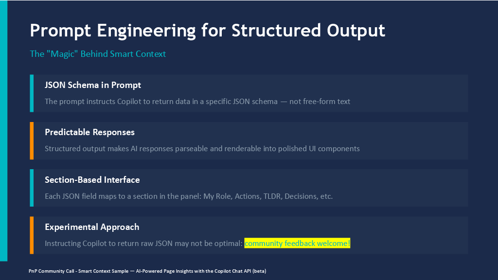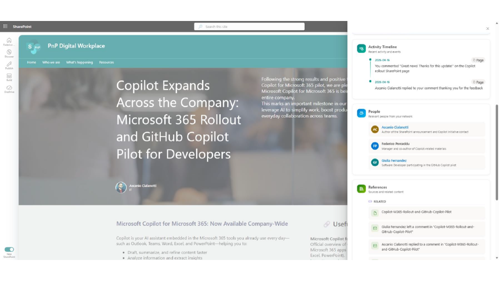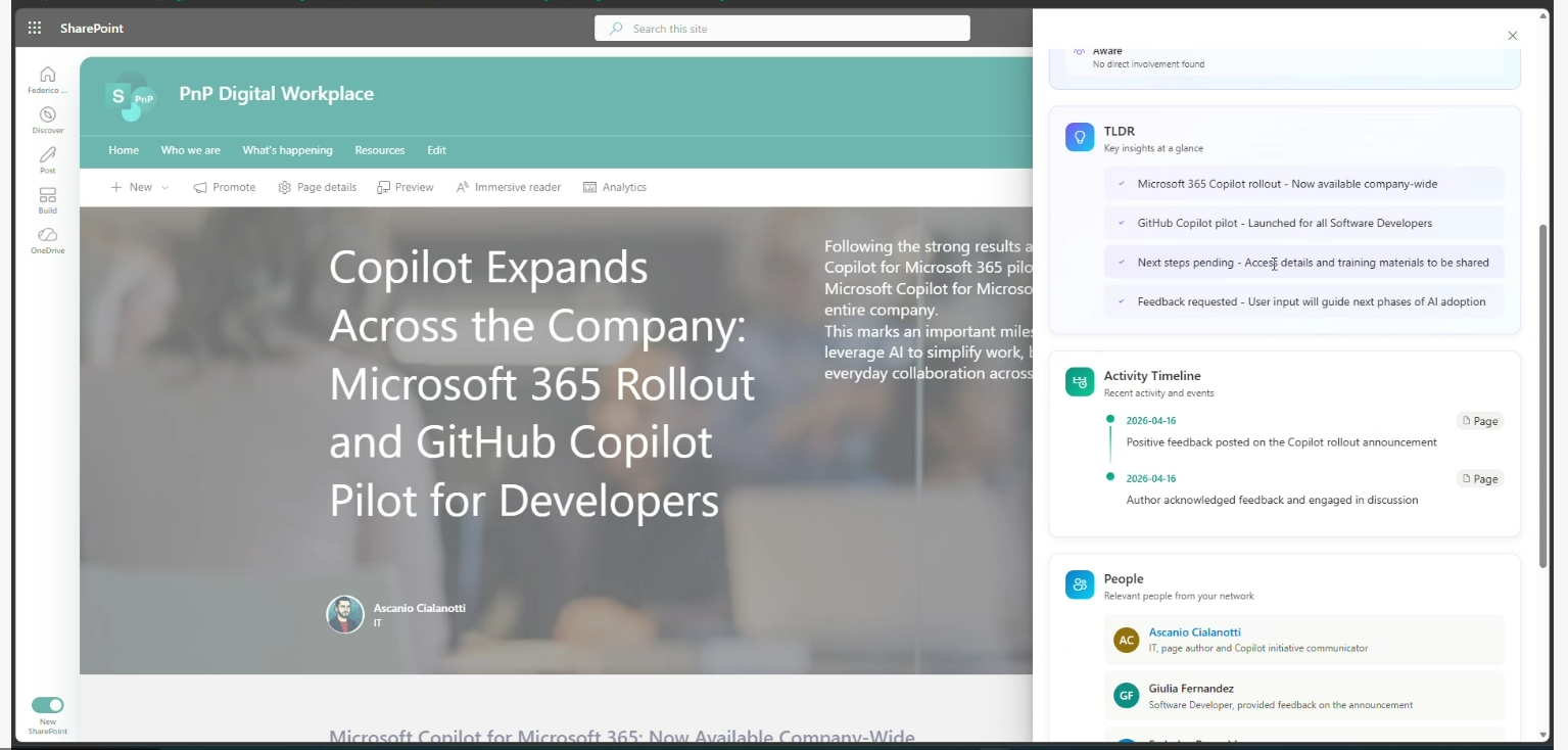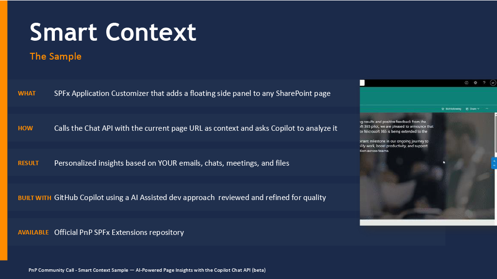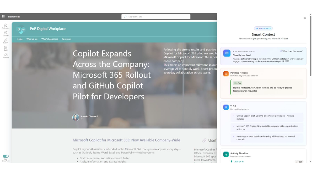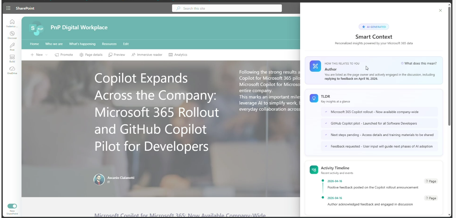 - Smart Context – AI-Powered Page Insights Community Sample – https://github.com/pnp/sp-dev-fx-extensions/tree/main/samples/react-application-smart-context