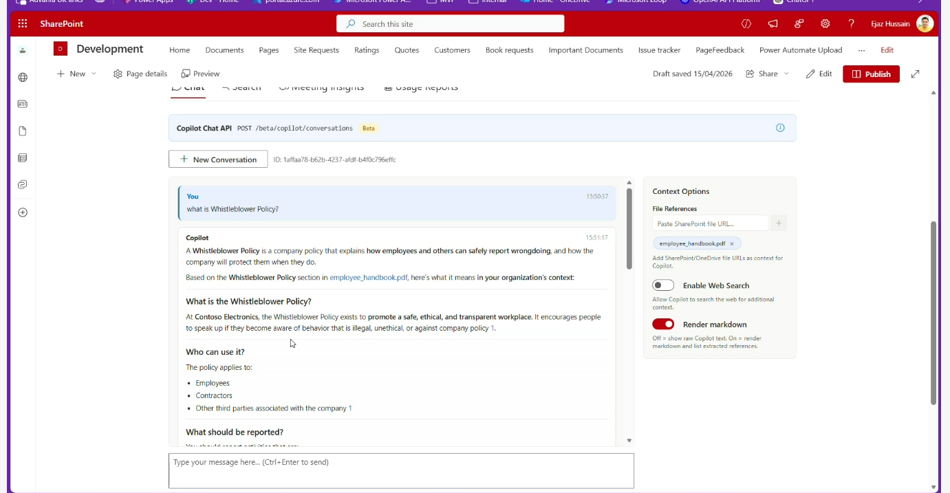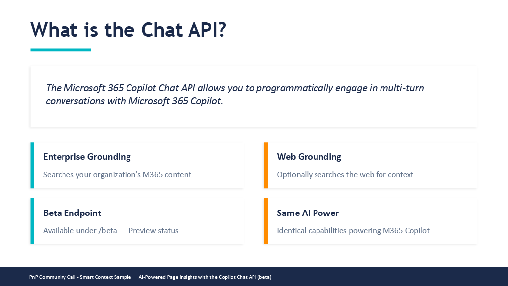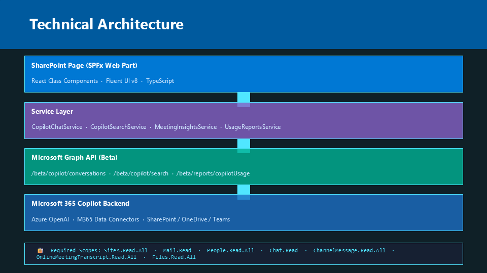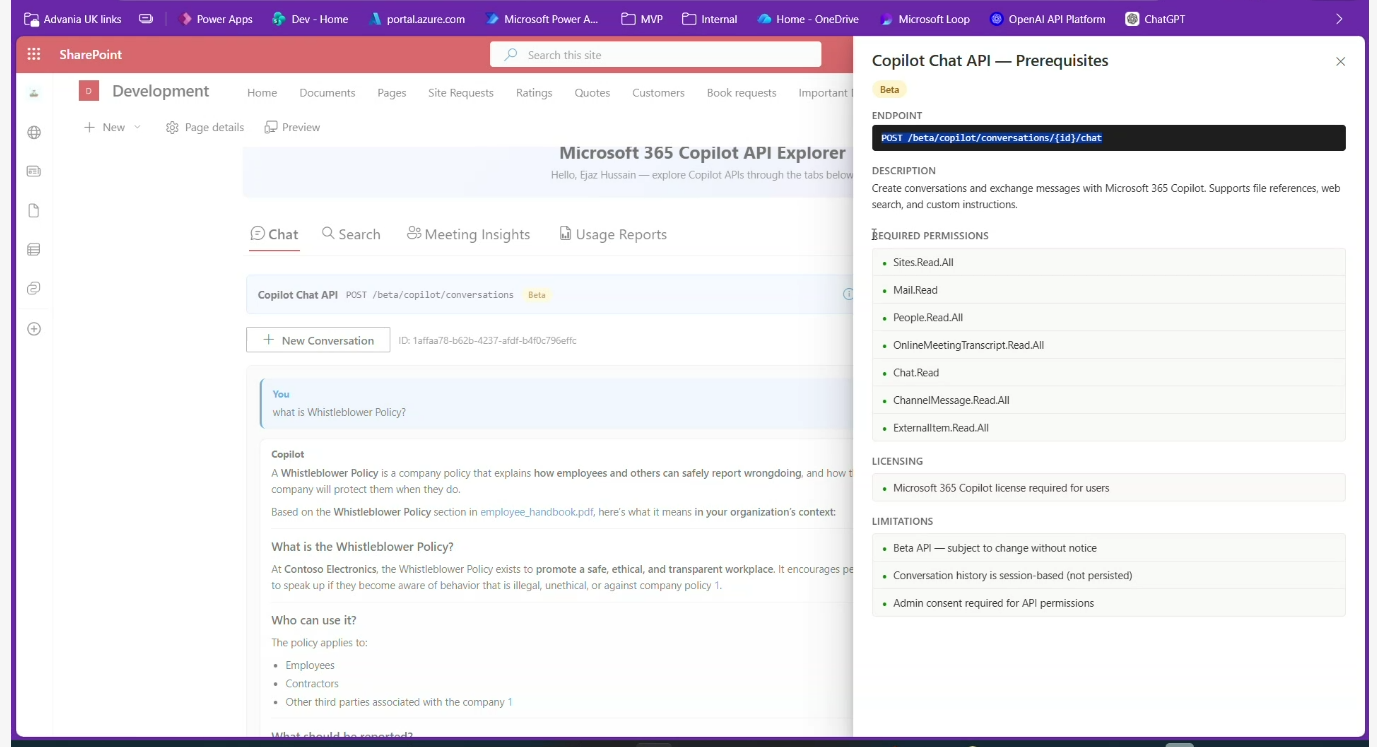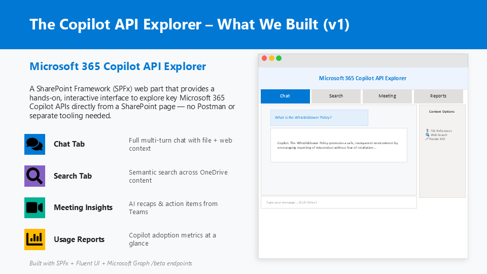- Microsoft 365 Copilot API Explorer (SPFx) Community Sample – https://github.com/pnp/sp-dev-fx-webparts/tree/main/samples/react-copilot-apis-explorer