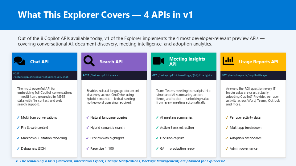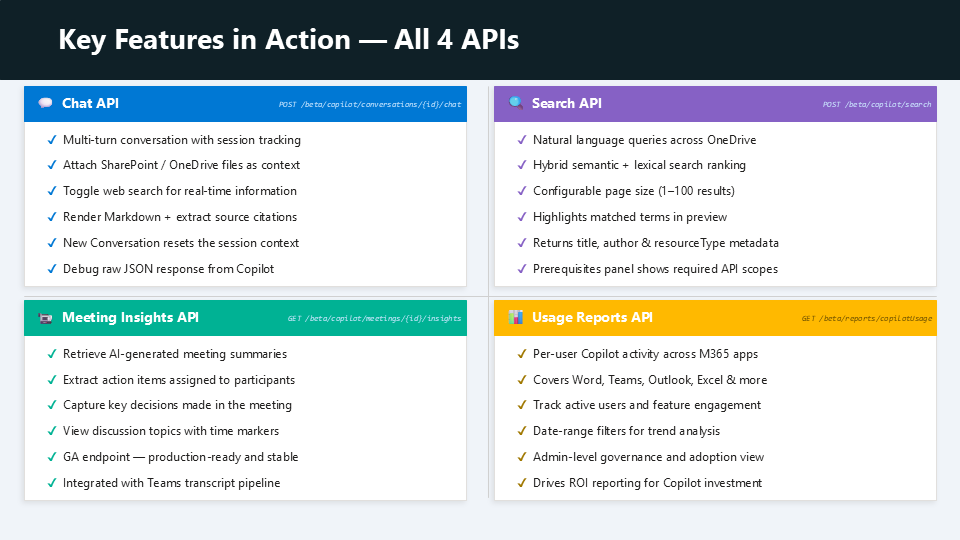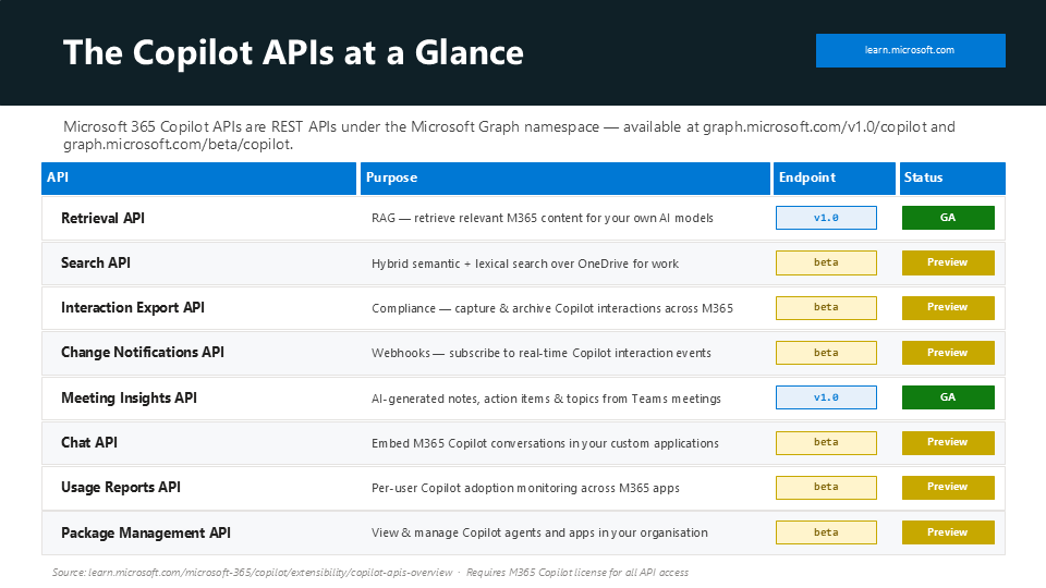 - MS Docs Copilot APIs – https://learn.microsoft.com/en-us/microsoft-365/copilot/extensibility/copilot-apis-overview