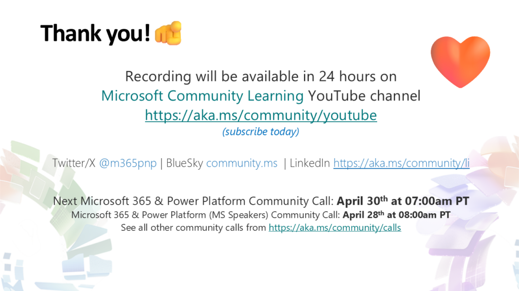- Community Call YouTube Recording from Microsoft will be available when uploaded by Microsoft