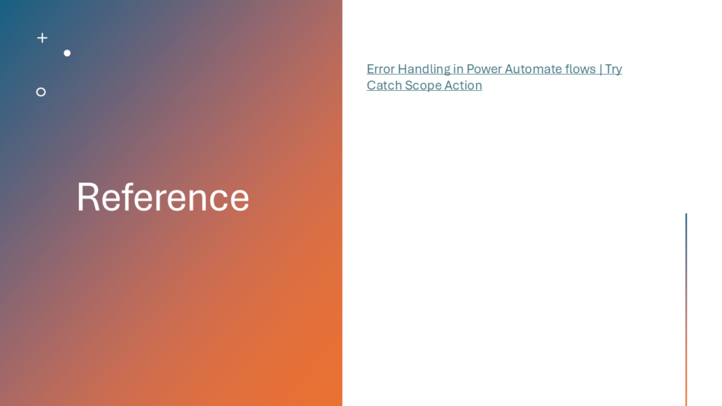 - Error Handling in Power Automate flows | Try Catch Scope Action – https://www.youtube.com/watch?v=qLADf8ne5qQ